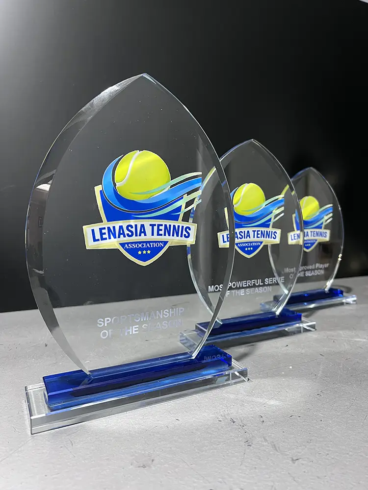 Glass on glass base. Engraving and logo included.